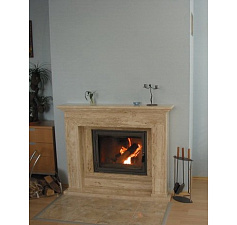 Цокольная и боковые части камина выполнены из колотого мрамора. Плита полированная из темно-коричневого камня. Балка из массива экзотического дерева.